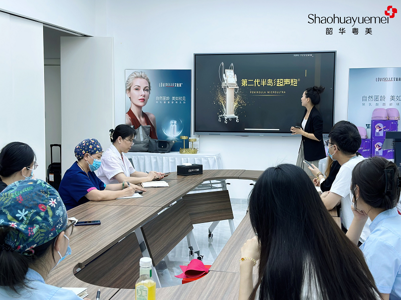 当半岛第二代超声炮和黄极光舒敏光疗仪正式入场时,韶华粤美全体医疗服务人员进行了严格的知识理论培训、项目详解、术前术后等相关知识的培训,并进行考核。操作医生、院长进行严格的仪器操作培训,设备进行全方位的测试,并进行了模特操作实操。